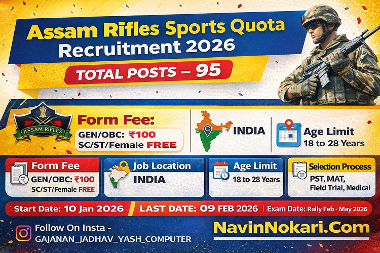 Assam Rifles Sports Quota Bharti 2026 अंतर्गत Rifleman / Riflewoman (General Duty) पदासाठी एकूण 95 जागा भरल्या जाणार आहेत. ही भरती Ministry of Home Affairs, Government of India अंतर्गत होणार आहे. ऑनलाईन अर्ज प्रक्रिया 10 January 2026 पासून सुरू होणार असून शेवटची तारीख 09 February 2026 आहे. भरती रॅली फेब्रुवारी ते मे 2026 दरम्यान होणार आहे.