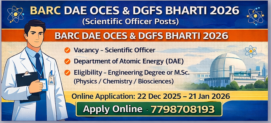 BARC DAE OCES & DGFS Bharti 2026 (Scientific Officer Posts) | बार्क डीएई ओसीईएस व डीजीएफएस भरती 2026 अंतर्गत Department of Atomic Energy (DAE) मार्फत वैज्ञानिक अधिकारी (Group-A) पदांसाठी भरती करण्यात येत आहे. ही भरती OCES-2026 (One Year Orientation Course) आणि DGFS-2026 (Two Year Graduate Fellowship Scheme) या प्रशिक्षण योजनांद्वारे केली जाणार आहे. प्रशिक्षण पूर्ण