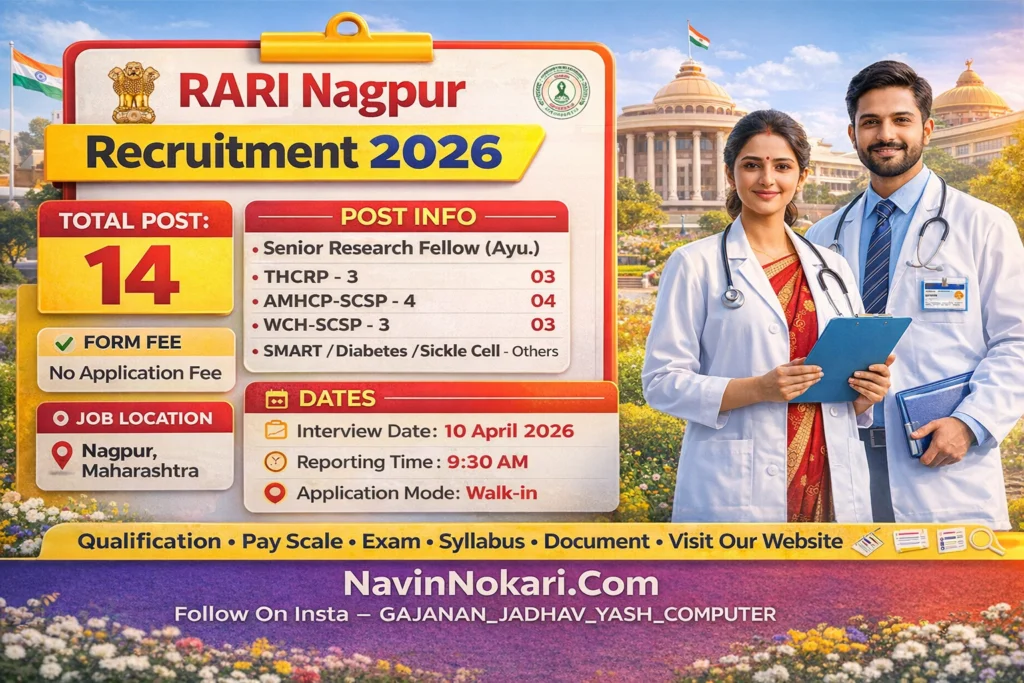 प्रादेशिक आयुर्वेद संशोधन संस्था (RARI), नागपूर अंतर्गत ‘वरिष्ठ अनुसंधान अध्येता (आयुर्वेद)’ या पदांसाठी RARI Nagpur Bharti 2026 जाहीर झाली आहे. एकूण 14 रिक्त पदे भरण्यासाठी थेट मुलाखतीचे (Walk-in-Interview) आयोजन करण्यात आले आहे. BAMS पदवीधारक उमेदवारांसाठी ही एक उत्तम संधी आहे. इच्छुक आणि पात्र उमेदवारांनी 10 एप्रिल 2026 रोजी थेट मुलाखतीसाठी उपस्थित राहावे. अधिक माहितीसाठी सविस्तर