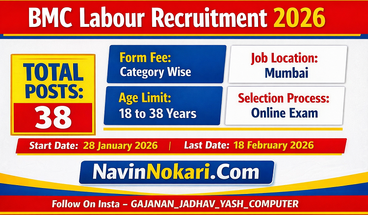 BMC Labour Bharti 2026 (38 Posts) | बृहन्मुंबई महानगरपालिका कामगार भरती 2026 अंतर्गत बृहन्मुंबई महानगरपालिका कामगार विभागामध्ये “कामगार” (गट-ड) पदासाठी एकूण 38 रिक्त जागा भरण्यात येणार आहेत. पात्र उमेदवारांकडून ऑनलाइन पद्धतीने अर्ज मागविण्यात येत आहेत. निवड प्रक्रिया ऑनलाइन परीक्षा द्वारे होणार आहे.