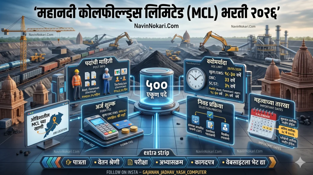 POWERGRID Recruitment 2026: पॉवरग्रीड (POWERGRID) अंतर्गत देशभरात डिप्लोमा ट्रेनी, ज्युनियर ऑफिसर ट्रेनी आणि ज्युनियर टेक्निशियन ट्रेनी या पदांच्या एकूण 668 जागांसाठी मेगा भरती जाहीर झाली आहे. यासाठी पात्र आणि इच्छुक उमेदवारांकडून ऑनलाईन अर्ज मागविण्यात येत आहेत. अर्ज करण्याची शेवटची तारीख 11 मे 2026 आहे. सविस्तर माहिती आणि शैक्षणिक पात्रतेसाठी पूर्ण जाहिरात नक्की वाचा. क्र. पदाचे […]