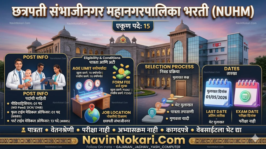 शिर्डी साईबाबा संस्थान (Shirdi Saibaba Sansthan) अंतर्गत साईबाबा हॉस्पीटल व साईनाथ रूग्णालयासाठी ‘Shirdi Saibaba Sansthan Bharti’ जाहीर झाली आहे. या भरतीद्वारे Neurologists, C.M.O., R.M.O., आणि इतर तज्ज्ञ डॉक्टरांच्या एकूण 37 जागा भरल्या जाणार आहेत. ही पदे 11 महिन्यांच्या कंत्राटी तत्त्वावर भरली जातील. इच्छुक आणि पात्र उमेदवारांनी आपले अर्ज ऑफलाईन पद्धतीने सादर करायचे आहेत. अर्ज जमा […]