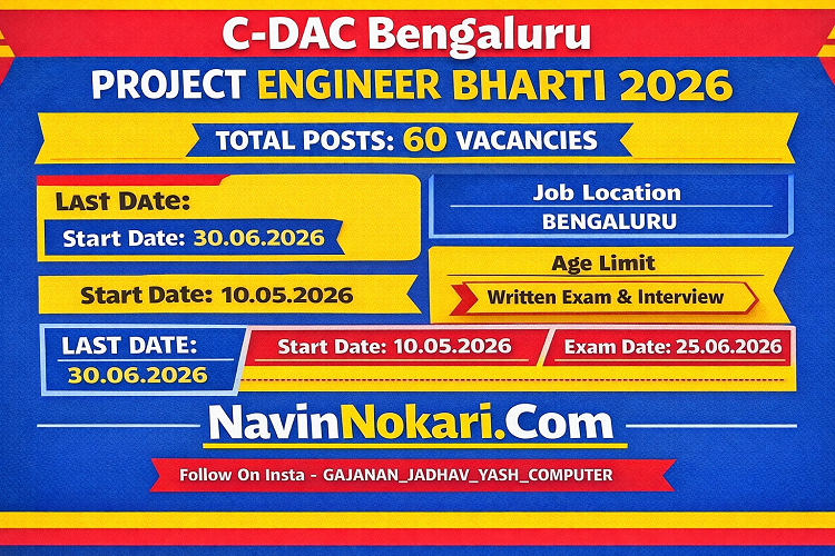 CDAC Bengaluru Project Engineer Bharti 2026 (60 Posts) | सी-डॅक बेंगलुरु प्रोजेक्ट इंजिनिअर भरती 2026 अंतर्गत विविध तांत्रिक प्रकल्पांसाठी कराराधारित पद्धतीने Project Engineer पदांची भरती करण्यात येत आहे. ही भरती C-DAC Bengaluru केंद्रामार्फत Walk In Interview द्वारे होणार असून पात्र उमेदवारांना संधी उपलब्ध आहे. पात्रता, वय मर्यादा, वेतन, निवड प्रक्रिया आणि इतर संपूर्ण माहिती खाली दिली आहे.