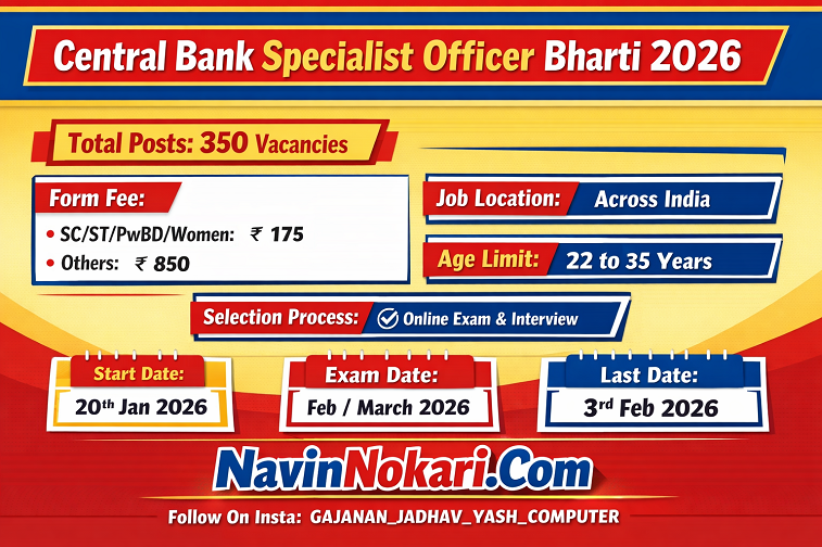 Central Bank Specialist Officer Bharti 2026 (350 Posts) | सेंट्रल बँक ऑफ इंडिया स्पेशालिस्ट ऑफिसर भरती 2026