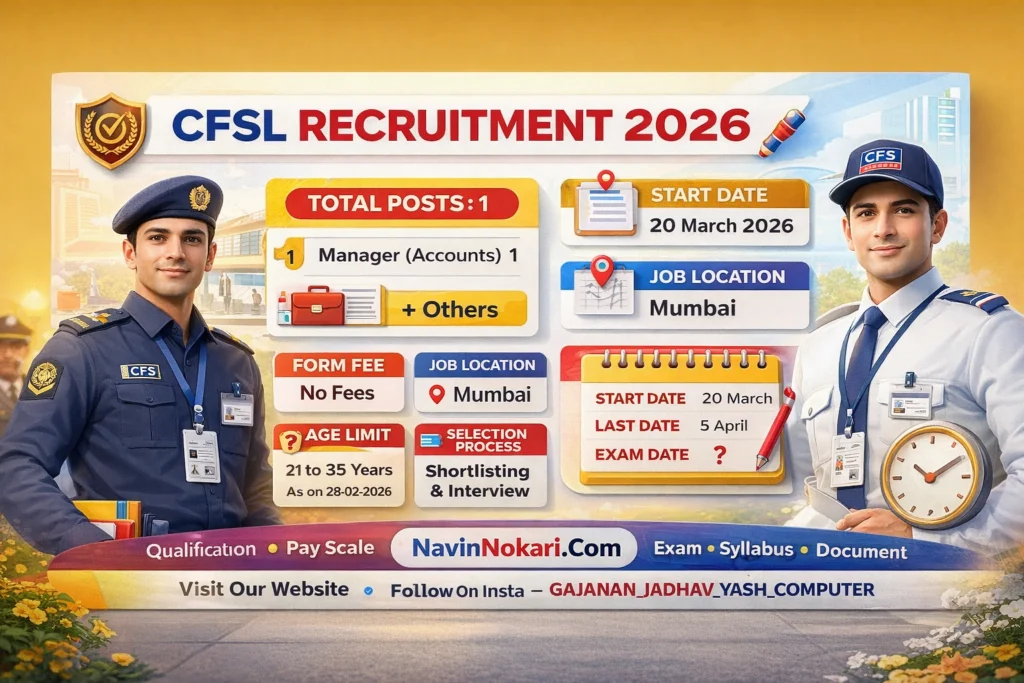 CFSL Bharti 2026 अंतर्गत सेंटबँक फायनान्शियल सर्व्हिसेस लिमिटेड (Centbank Financial Services Limited) मध्ये Manager (Accounts) या पदासाठी भरती जाहीर करण्यात आली आहे. इच्छुक व पात्र उमेदवारांकडून अर्ज मागविण्यात आले आहेत. ही भरती करार पद्धतीवर (Contract Basis) करण्यात येत आहे. या भरतीसाठी अर्ज प्रक्रिया 20 March 2026 पासून सुरू झाली असून अर्ज करण्याची शेवटची तारीख 5 April 2026 आहे. निवड प्रक्रिया Shortlisting आणि Interview द्वारे होणार आहे. नोकरीचे ठिकाण Mumbai राहणार आहे.