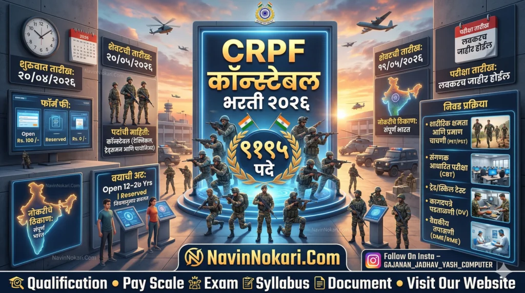 सेंट्रल रिझर्व्ह पोलीस फोर्स (CRPF) मध्ये ‘CRPF Constable Bharti’ अंतर्गत कॉन्स्टेबल (टेक्निकल, ट्रेड्समन आणि पायोनिअर) पदांच्या एकूण 9195 जागांसाठी अधिकृत जाहिरात प्रसिद्ध झाली आहे. जे उमेदवार 10वी पास आहेत आणि संरक्षण क्षेत्रात नोकरी करण्यास इच्छुक आहेत त्यांच्यासाठी ही एक सुवर्णसंधी आहे. या भरतीसाठी देशभरातून ऑनलाईन पद्धतीने अर्ज मागविण्यात येत आहेत. अर्ज करण्याची शेवटची तारीख 19/ 05/ 2026 आहे. अधिक माहितीसाठी संपूर्ण जाहिरात नक्की वाचा.