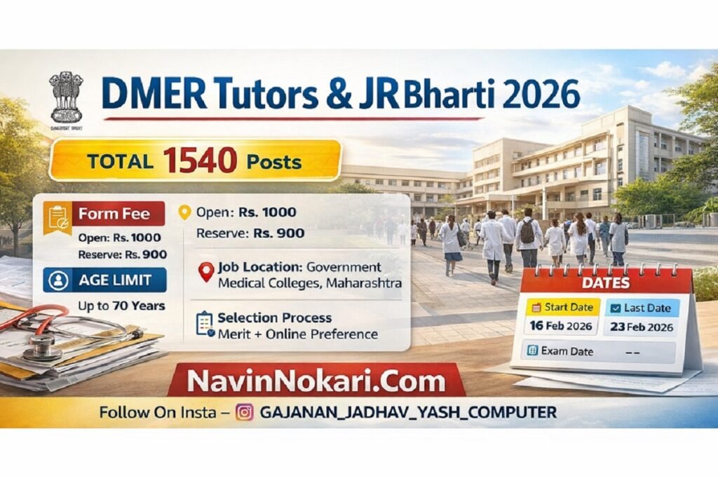 DMER Tutors & Junior Residents Bharti 2026 (1540 Posts) | डीएमईआर ट्यूटर व ज्युनियर रेसिडेंट भरती 2026 अंतर्गत महाराष्ट्रातील शासकीय वैद्यकीय महाविद्यालयांमध्ये एकूण 1540 ट्यूटर व ज्युनियर रेसिडेंट पदे भरली जाणार आहेत. पात्रता म्हणून MBBS पदवी व MMC/NMC नोंदणी आवश्यक आहे. वयोमर्यादा NMC नियमांनुसार आहे. निवड प्रक्रिया MBBS गुणांवर आधारित मेरिट व ऑनलाइन प्राधान्यक्रम यावर होईल. निवड झालेल्या उमेदवारांना 1 वर्ष प्रशिक्षण/नियुक्ती कालावधी दिला जाईल.
