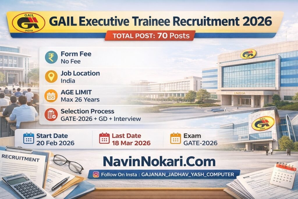 GAIL Executive Trainee Bharti 2026 (70 Posts) | गेल इंडिया एक्झिक्युटिव्ह ट्रेनी भरती 2026 अंतर्गत एकूण 70 एक्झिक्युटिव्ह ट्रेनी पदांसाठी भरती जाहीर करण्यात आली आहे. ही भरती GATE-2026 गुणांच्या आधारे होणार असून पात्र अभियांत्रिकी पदवीधर उमेदवारांना अर्ज करण्याची संधी आहे. निवड प्रक्रिया GATE स्कोअर, ग्रुप डिस्कशन व मुलाखत यावर आधारित असेल. नोकरीचे ठिकाण भारतभर असून आकर्षक वेतन ₹60,000 ते ₹1,80,000 पे स्केल दिला जाणार आहे. अर्ज प्रक्रिया 20 फेब्रुवारी 2026 पासून सुरू होऊन 18 मार्च 2026 पर्यंत चालणार आहे.
