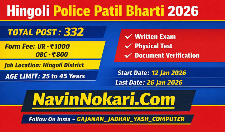 Hingoli Police Patil Bharti 2026 (332 Posts) | हिंगोली पोलीस पाटील भरती 2026 अंतर्गत हिंगोली जिल्ह्यात एकूण 332 पोलीस पाटील पदांसाठी भरती जाहीर करण्यात आली आहे. 10 वी उत्तीर्ण उमेदवारांना ऑनलाइन अर्ज करता येणार आहे. अर्ज प्रक्रिया 12 जानेवारी 2026 पासून सुरु होऊन 26 जानेवारी 2026 रोजी बंद होणार आहे. पात्र उमेदवारांनी अधिकृत वेबसाईट https://hingoli.nic.in