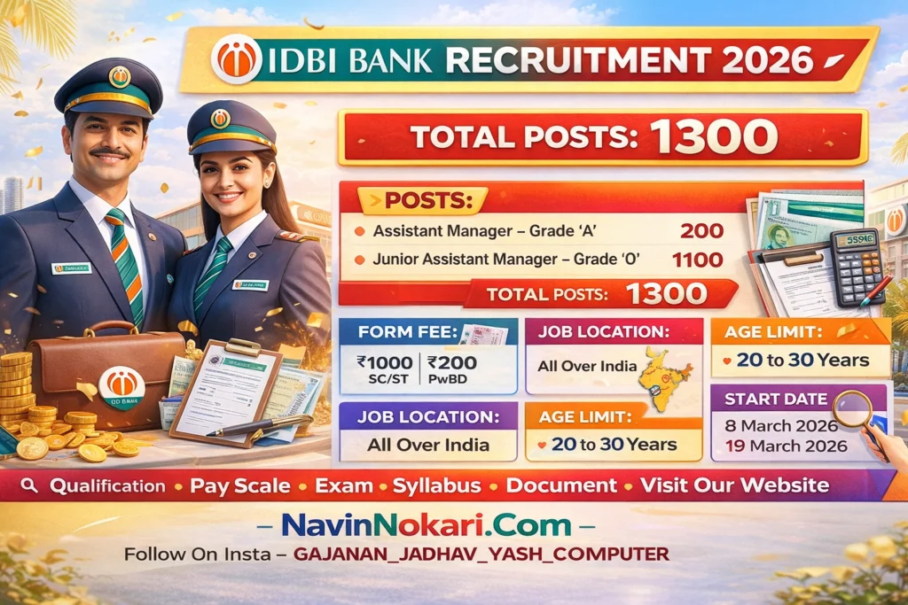 IDBI Bank Bharti 2026 (1300 Posts) | आयडीबीआय बँक भरती 2026 अंतर्गत IDBI Bank Ltd. मार्फत Assistant Manager – Grade ‘A’ आणि Junior Assistant Manager (JAM) – Grade ‘O’ या पदांसाठी एकूण 1300 जागांची भरती जाहीर करण्यात आली आहे. इच्छुक व पात्र उमेदवारांकडून ऑनलाइन पद्धतीने अर्ज मागविण्यात येत आहेत. उमेदवारांनी शैक्षणिक पात्रता, वयोमर्यादा, अर्ज शुल्क, निवड प्रक्रिया आणि इतर सर्व माहिती तपासून अर्ज करावा. या भरतीसाठी ऑनलाइन अर्ज करण्याची प्रक्रिया 08 मार्च 2026 पासून सुरू होऊन 19 मार्च 2026 पर्यंत चालणार आहे.