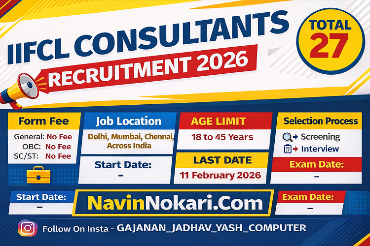 IIFCL Consultants Recruitment 2026 (27 Posts) | IIFCL प्रोजेक्ट्स लिमिटेड सल्लागार भरती 2026 अंतर्गत IIFCL Projects Limited मार्फत विविध Individual Consultant (IC) पदांसाठी अर्ज मागविण्यात येत आहेत. ही भरती पूर्णवेळ कंत्राटी स्वरूपात असून उमेदवारांची निवड मुलाखतीद्वारे केली जाणार आहे.