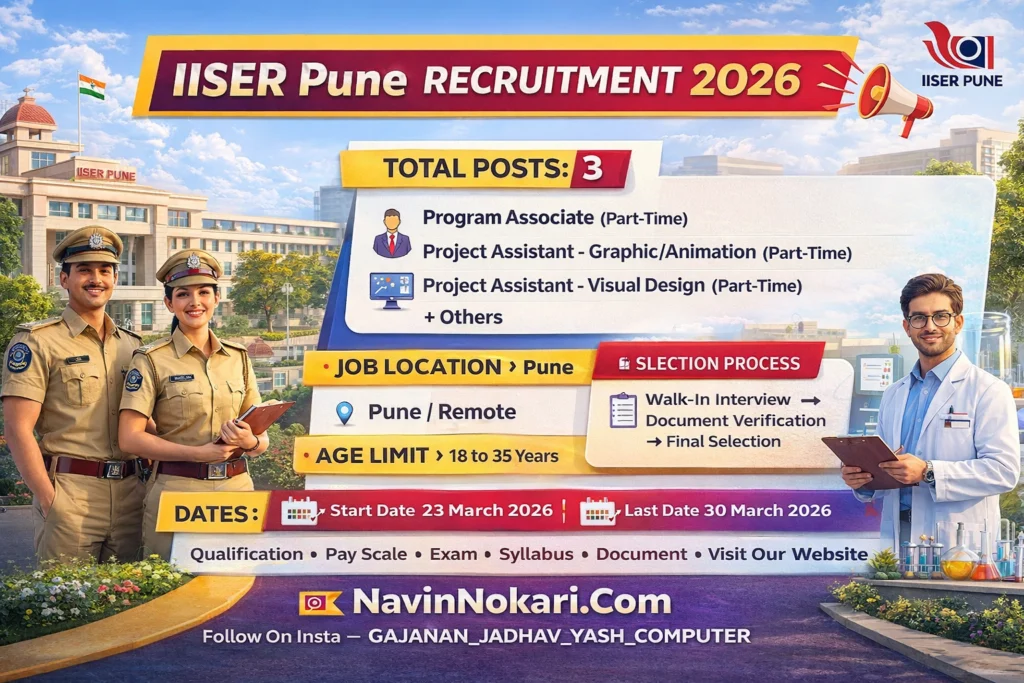 IISER Pune Bharti 2026 (3 Posts) | आयआयएसईआर पुणे भरती 2026 अंतर्गत भारतीय विज्ञान शिक्षण व संशोधन संस्था पुणे येथे विविध पदांसाठी उमेदवारांची निवड वॉक-इन मुलाखतीद्वारे करण्यात येणार आहे. या भरतीमध्ये Program Associate (Part-Time), Project Assistant – Graphic/Animation (Part-Time) आणि Project Assistant – Visual Design (Part-Time) या पदांसाठी एकूण 3 रिक्त जागा जाहीर करण्यात आल्या आहेत. इच्छुक उमेदवारांनी 30 मार्च 2026 रोजी IISER Pune कॅम्पस येथे वॉक-इन इंटरव्ह्यूसाठी उपस्थित राहावे. ही नियुक्ती तात्पुरत्या व करार पद्धतीवर करण्यात येणार आहे.