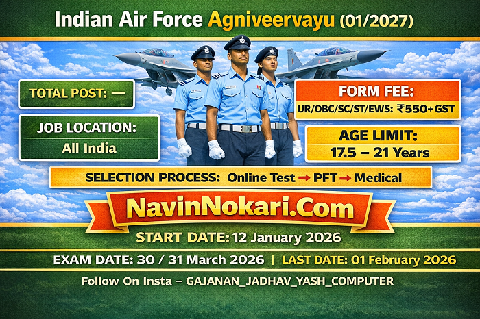 Indian Air Force Agniveervayu (01/2027) | भारतीय हवाई दल अग्निवीरवायू भरती 01/2027 अंतर्गत अग्निपथ योजनेअंतर्गत अविवाहित पुरुष व महिला उमेदवारांकडून ऑनलाइन अर्ज मागविण्यात येत आहेत. ही भरती AGNIVEERVAYU INTAKE 01/2027 साठी आहे.
