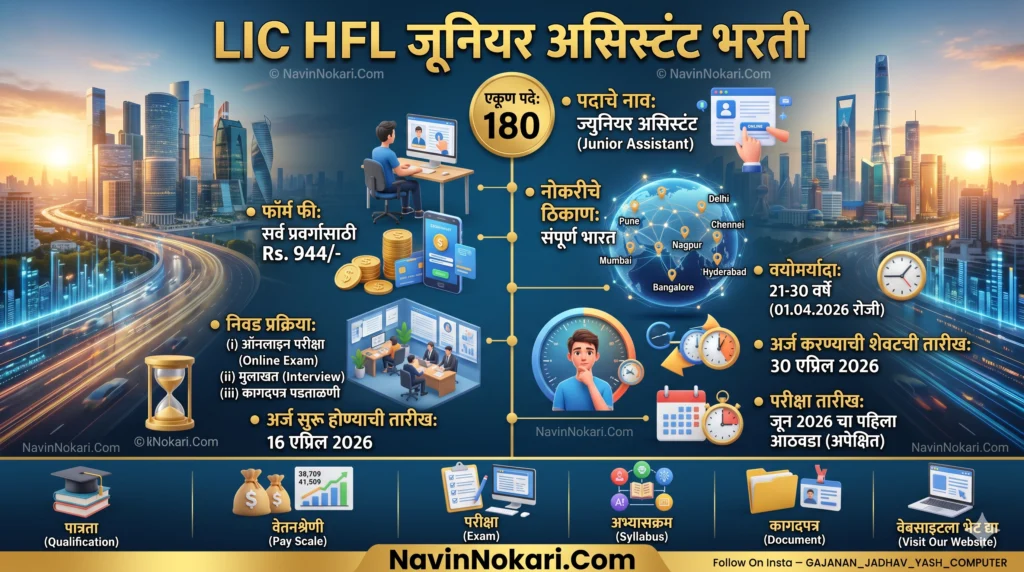 LIC HFL Bharti 2026: एलआयसी हाऊसिंग फायनान्स लिमिटेड (LIC Housing Finance Ltd) मध्ये ‘ज्युनियर असिस्टंट’ (Junior Assistant) पदांच्या एकूण 180 जागांसाठी मोठी भरती जाहीर झाली आहे. पदवीधर उमेदवारांसाठी ही उत्तम संधी असून, ऑनलाईन अर्ज करण्याची शेवटची तारीख 30 एप्रिल 2026 आहे. सविस्तर माहिती, पात्रता आणि अर्ज करण्यासाठी खालील माहिती वाचा.