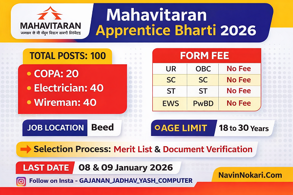 Mahavitaran Apprentice Bharti 2026 (100 Posts) | महावितरण अप्रेंटिस भरती 2026 अंतर्गत बीड जिल्ह्यात अप्रेंटिस पदांसाठी उमेदवारांकडून अर्ज मागविण्यात येत आहेत. पात्र उमेदवारांनी दिलेल्या तारखेत आवश्यक कागदपत्रांसह अर्ज सादर करावा.