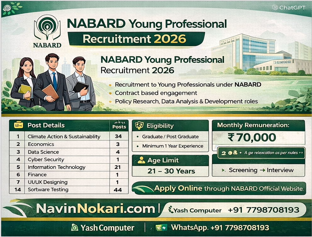 NABARD Young Professional Bharti 2026 (44 Posts) | नाबार्ड यंग प्रोफेशनल भरती 2026 अंतर्गत National Bank for Agriculture and Rural Development (NABARD) मध्ये करार तत्वावर Young Professional पदांसाठी अर्ज मागविण्यात येत आहेत. ही भरती पूर्णपणे कराराधारित असून धोरण संशोधन, कार्यक्रम मूल्यमापन व ग्रामीण विकास क्षेत्रातील अनुभव मिळविण्यासाठी आहे. ऑनलाइन अर्ज NABARD च्या अधिकृत संकेतस्थळावर स्वीकारले जातील.