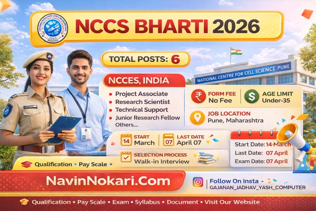 राष्ट्रीय कोशिका विज्ञान केंद्र (NCCS), पुणे यांनी विविध प्रकल्प पदांसाठी NCCS Pune Bharti 2026 जाहीर केली आहे. या भरती अंतर्गत Project Associate, Project Research Scientist, Project Technical Support, Junior Research Fellow अशा विविध पदांसाठी उमेदवारांची निवड केली जाणार आहे. ही भरती Walk-in Interview पद्धतीने होणार असून मुलाखत 7 एप्रिल 2026 रोजी NCCS Pune येथे आयोजित करण्यात आली आहे. पात्र उमेदवारांनी आवश्यक कागदपत्रांसह मुलाखतीस उपस्थित राहावे.