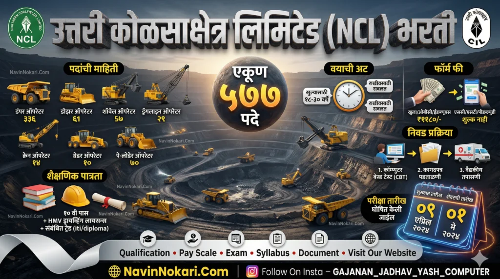 नॉर्दर्न कोलफील्ड्स लिमिटेड (NCL) मध्ये HEMM ऑपरेटर, पॅरामेडिकल स्टाफ आणि ओव्हरसिअर पदांच्या एकूण 577 जागांसाठी NCL Bharti 2026 जाहीर. ऑनलाईन अर्ज करण्याची शेवटची तारीख 01 मे 2026 आहे. पात्र उमेदवार अंतिम तारखेपूर्वी अर्ज करू शकतात.