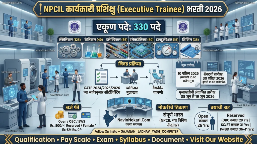 न्यूक्लिअर पॉवर कॉर्पोरेशन ऑफ इंडिया लिमिटेड (NPCIL) द्वारे ‘कार्यकारी प्रशिक्षु (Executive Trainee)’ या पदांच्या 330 जागांसाठी जाहिरात प्रसिद्ध करण्यात आली आहे. NPCIL Executive Trainee Bharti 2026 अंतर्गत मेकॅनिकल, केमिकल, इलेक्ट्रिकल व इतर शाखांतील उमेदवारांची GATE 2024/ 2025/ 2026 च्या स्कोअरवर निवड केली जाईल. पात्र आणि इच्छुक उमेदवार 30 एप्रिल 2026 पर्यंत अधिकृत वेबसाईटवर ऑनलाईन अर्ज करू शकतात. या भरतीची शैक्षणिक पात्रता, वयाची अट व फी बद्दल संपूर्ण माहिती खालीलप्रमाणे आहे.