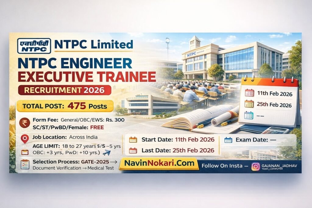 NTPC Engineer Bharati 2026 (475 Posts) | एनटीपीसी इंजिनियर एक्झिक्युटिव्ह ट्रेनिंग भरती 2026 अंतर्गत NTPC Limited मार्फत एकूण 475 Engineer Executive Trainee पदांसाठी भरती जाहीर करण्यात आली आहे.