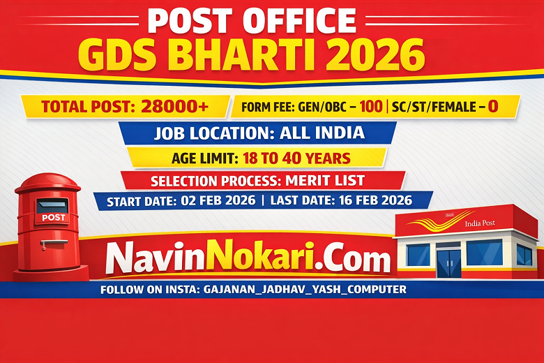 Post Office GDS Bharti 2026 (– Posts) | भारतीय डाक विभाग ग्रामीण डाक सेवक भरती 2026 अंतर्गत भारत सरकारच्या डाक विभागामार्फत (Department of Posts) ग्रामीण भागात Branch Postmaster (BPM), Assistant Branch Postmaster (ABPM) व Dak Sevak पदांसाठी ऑनलाइन अर्ज मागविण्यात येत आहेत. ही भरती १० वी उत्तीर्ण उमेदवारांसाठी असून निवड प्रक्रिया १० वीच्या गुणांवर आधारित मेरिट लिस्ट द्वारे केली जाणार आहे.