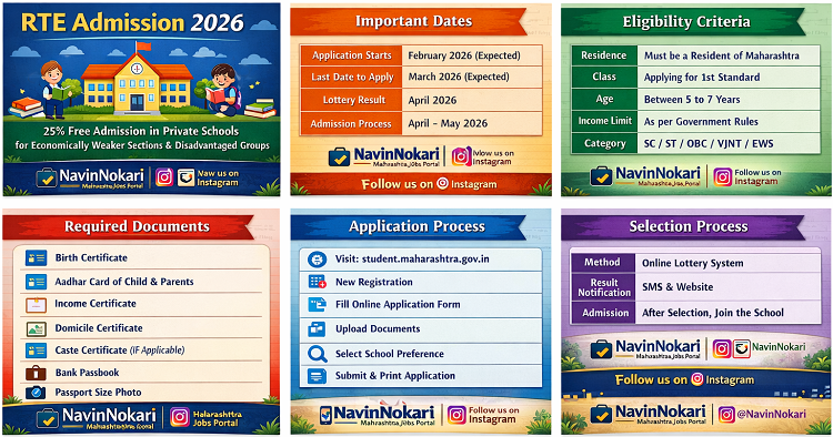 RTE Admission 2026 | आरटीई मोफत प्रवेश २०२६ अंतर्गत महाराष्ट्रातील खासगी शाळांमध्ये इयत्ता पहिलीसाठी 25% मोफत जागांसाठी ऑनलाईन अर्ज प्रक्रिया राबविण्यात येत आहे. या योजनेअंतर्गत आर्थिक दुर्बल व वंचित घटकातील पात्र विद्यार्थ्यांना मोफत शिक्षणाची संधी दिली जाते. RTE 25% Free Admission Scheme 2026 साठी अर्ज करण्यासाठी विद्यार्थी महाराष्ट्राचा रहिवासी असणे आवश्यक आहे. RTE Online Form 2026 भरण्यासाठी अधिकृत वेबसाईट student.maharashtra.gov.in येथे भेट द्यावी. या भरती / प्रवेश प्रक्रियेची संपूर्ण माहिती – पात्रता, वयोमर्यादा, आवश्यक कागदपत्रे, निवड प्रक्रिया, लॉटरी निकाल व महत्त्वाच्या तारखा खाली दिल्या आहेत.