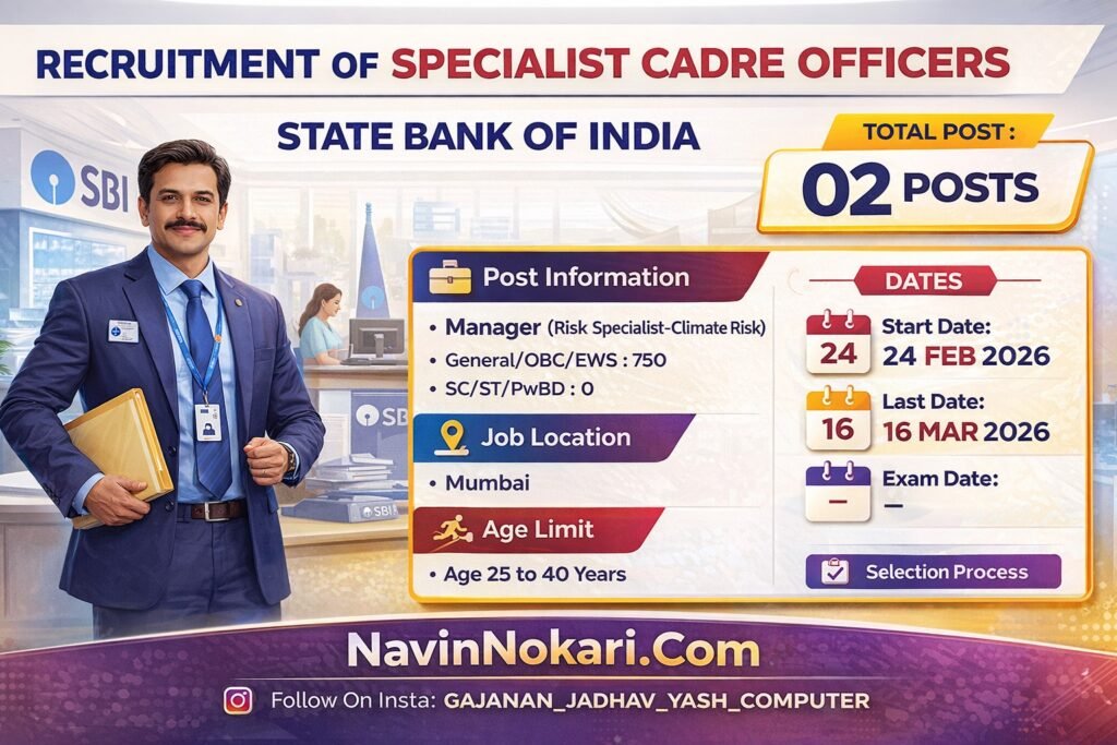 SBI Specialist Cadre Officer Bharti 2026 (02 Posts) | SBI स्पेशलिस्ट कॅडर ऑफिसर भरती 2026 अंतर्गत स्टेट बँक ऑफ इंडिया मार्फत Manager (Risk Specialist-Climate Risk) या पदासाठी पात्र उमेदवारांकडून ऑनलाइन अर्ज मागविण्यात आले आहेत. ही भरती नियमित स्वरूपाची असून निवड प्रक्रिया शॉर्टलिस्टिंग व मुलाखत आधारित आहे. इच्छुक उमेदवारांनी शैक्षणिक पात्रता, अनुभव व वयोमर्यादा निकष पूर्ण करून अर्ज करावा.