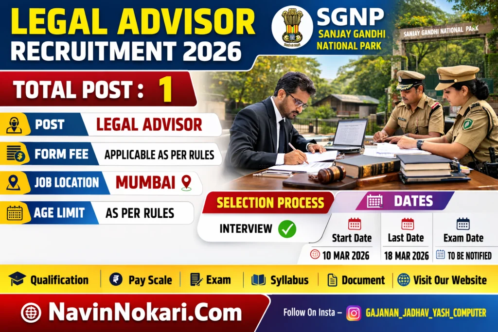 SGNP Legal Advisor Bharti 2026 (1 Post) | संजय गांधी राष्ट्रीय उद्यान लीगल अॅडव्हायझर भरती 2026 अंतर्गत मुंबई येथील संजय गांधी राष्ट्रीय उद्यान येथे Legal Advisor पदासाठी अर्ज मागविण्यात आले आहेत. ही नियुक्ती करार पद्धतीने 11 महिन्यांच्या कालावधीसाठी करण्यात येणार आहे. पात्र उमेदवारांकडून अर्ज मागविण्यात आले असून निवड प्रक्रिया मुलाखतीद्वारे होणार आहे. उमेदवारांनी कायद्याची पदवी (LLB) घेतलेली असावी तसेच उच्च न्यायालयात किमान 5 वर्षांचा अनुभव आवश्यक आहे. इच्छुक उमेदवारांनी अर्ज अंतिम तारखेपूर्वी सादर करावा.