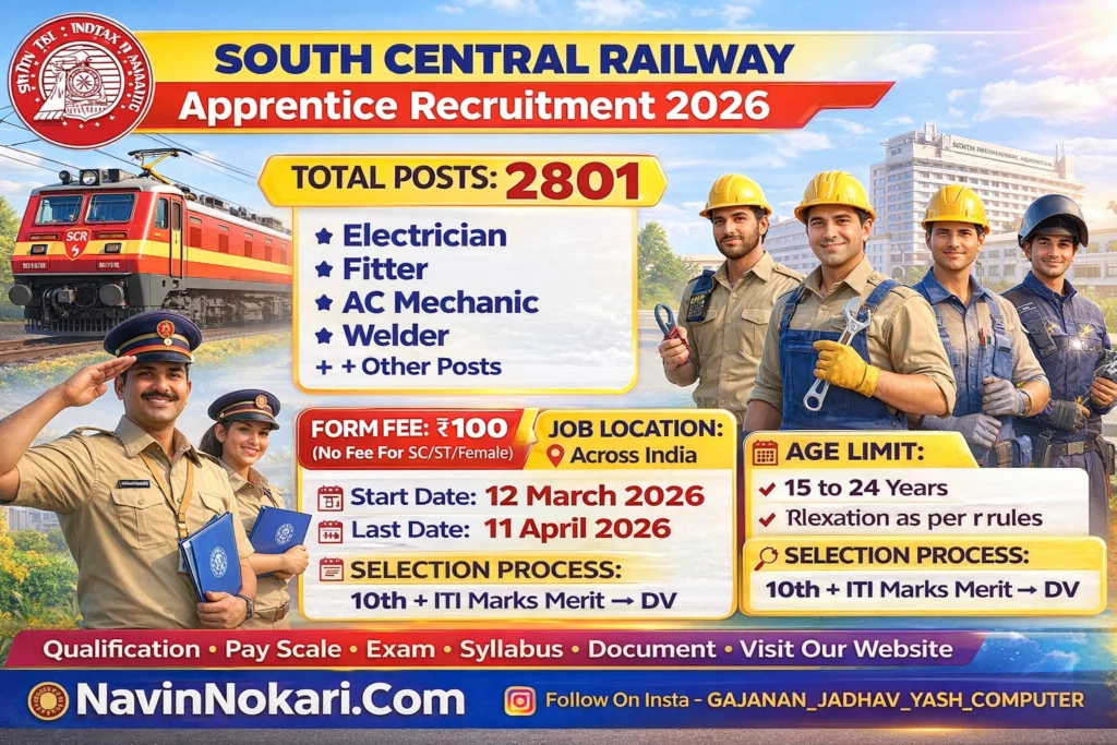 South Central Railway Apprentice Bharti 2026 (2801 Posts) | साऊथ सेंट्रल रेल्वे अप्रेंटिस भरती 2026