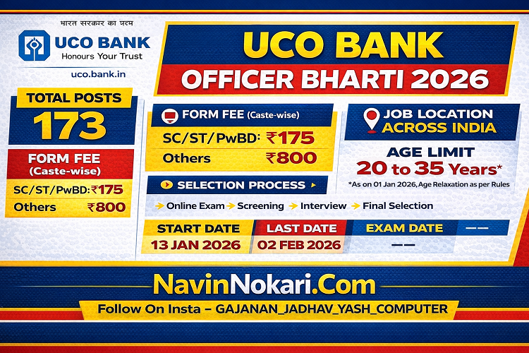 UCO Bank Officer Bharti 2026 (173 Posts) | युको बँक अधिकारी भरती 2026 अंतर्गत युको बँकेत Generalist व Specialist Cadre मधील विविध अधिकारी पदांसाठी ऑनलाइन अर्ज मागविण्यात येत आहेत. पात्र उमेदवारांनी जाहिरातीत नमूद केलेल्या अटी, शैक्षणिक पात्रता, वयोमर्यादा, शुल्क व निवड प्रक्रिया काळजीपूर्वक वाचून अर्ज करावा.