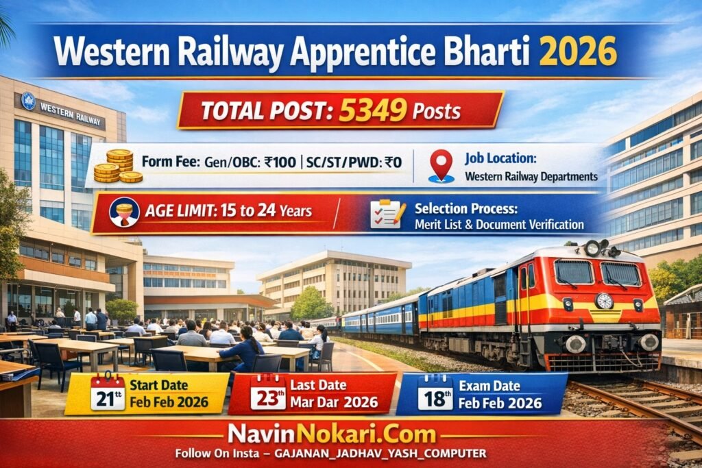 Western Railway Apprentice Bharti 2026 (5349 Posts) | पश्चिम रेल्वे अप्रेंटिस भरती 2026 अंतर्गत पश्चिम रेल्वे (RRC-WR) मार्फत विविध ट्रेडमध्ये एकूण 5349 अप्रेंटिस पदांसाठी ऑनलाईन अर्ज मागविण्यात आले आहेत. इच्छुक उमेदवारांनी 10वी उत्तीर्ण व संबंधित ITI पात्रता असणे आवश्यक आहे. अर्ज प्रक्रिया पूर्णपणे ऑनलाईन असून निवड गुणवत्ता यादी (Merit List) पद्धतीने केली जाणार आहे. पात्र उमेदवारांनी अंतिम दिनांकपूर्वी अर्ज करावा.